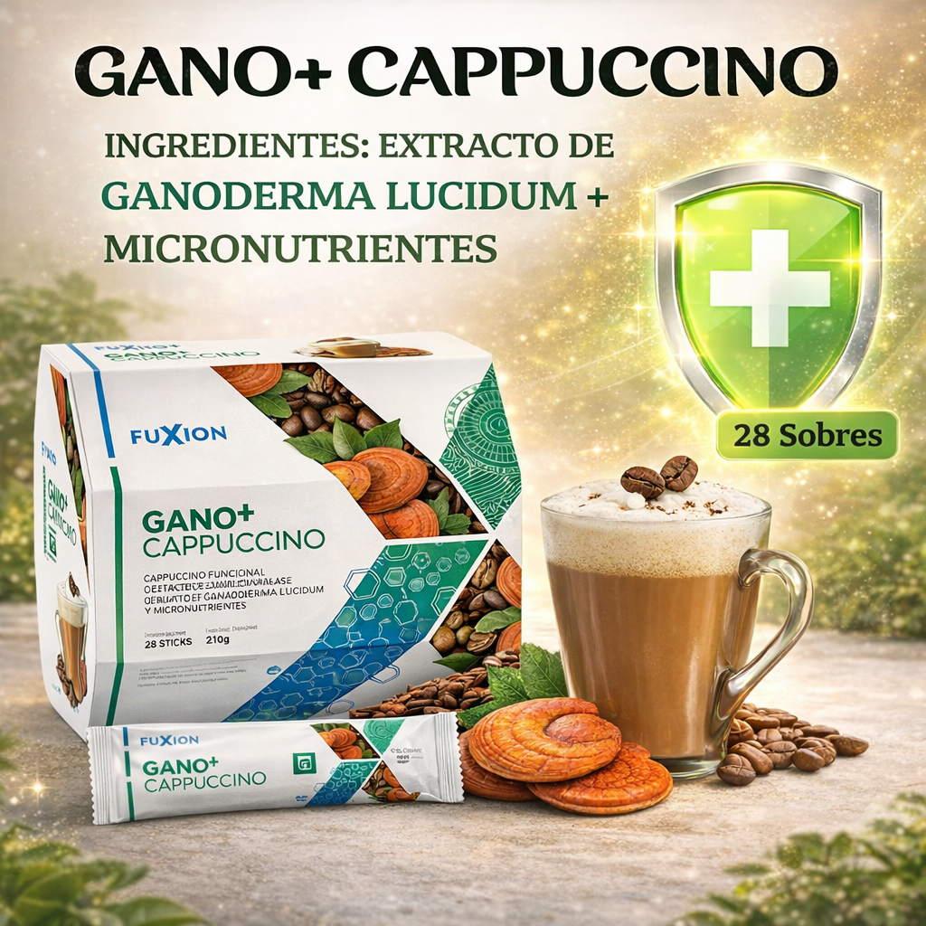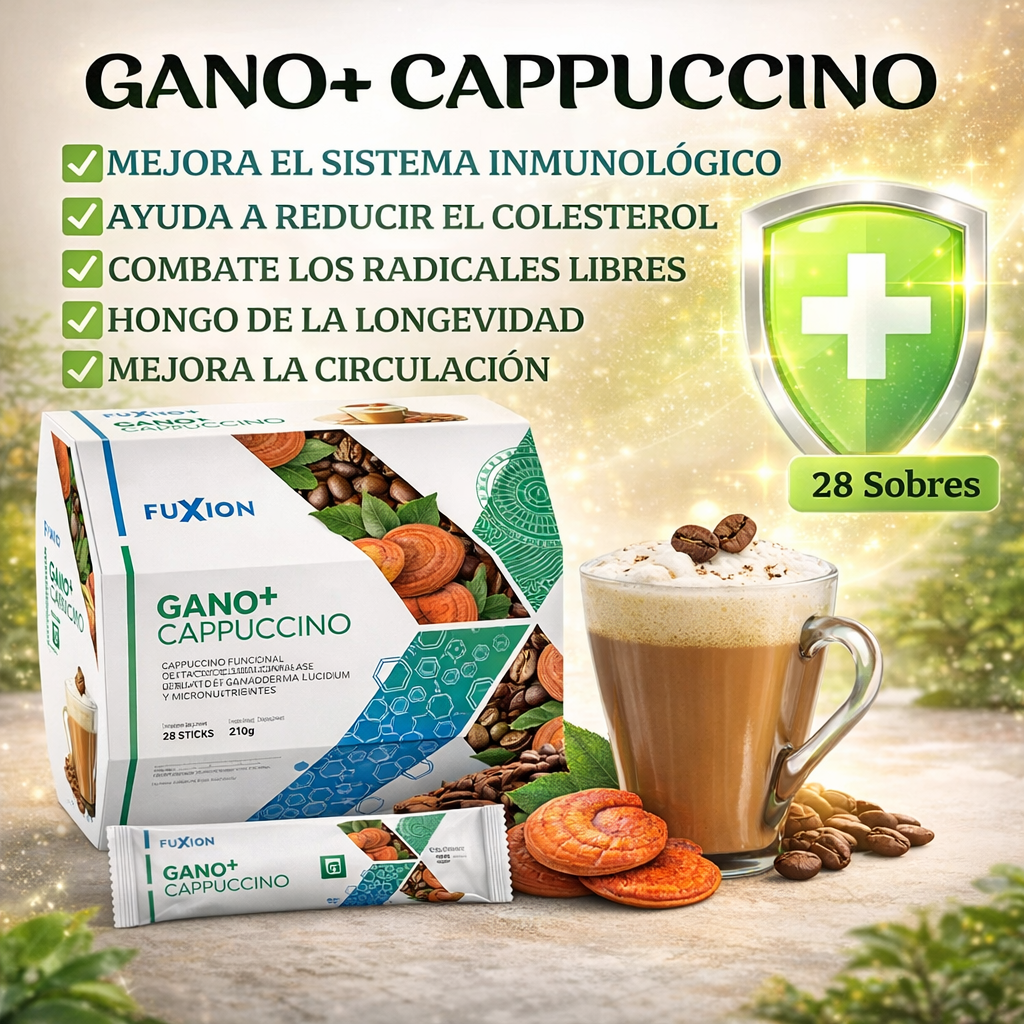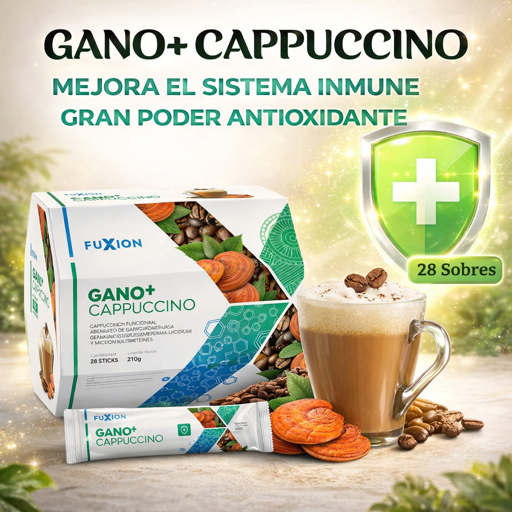 Gano + Cappuccino de Fuxion es un delicioso café cappuccino funcional elaborado con extracto de Ganoderma Lucidum y micronutrientes, diseñado para brindar una experiencia de sabor agradable mientras complementa un estilo de vida saludable.